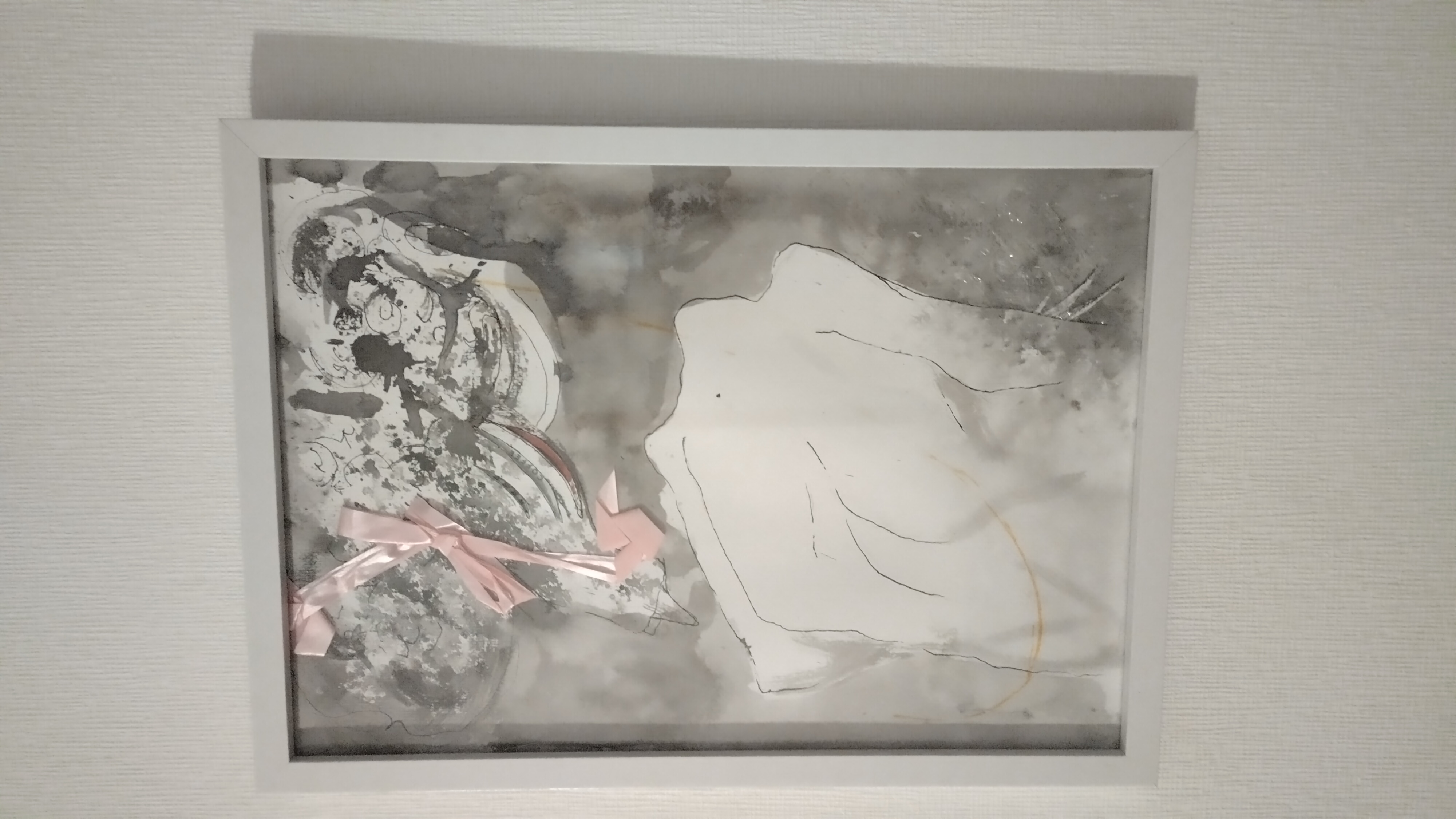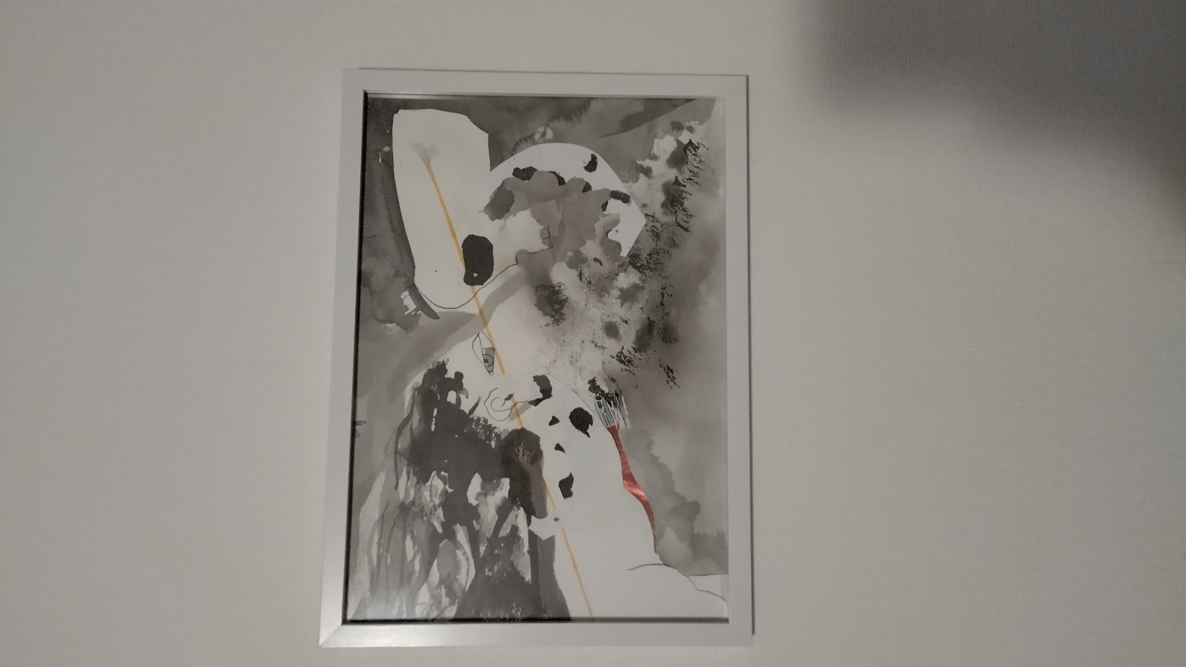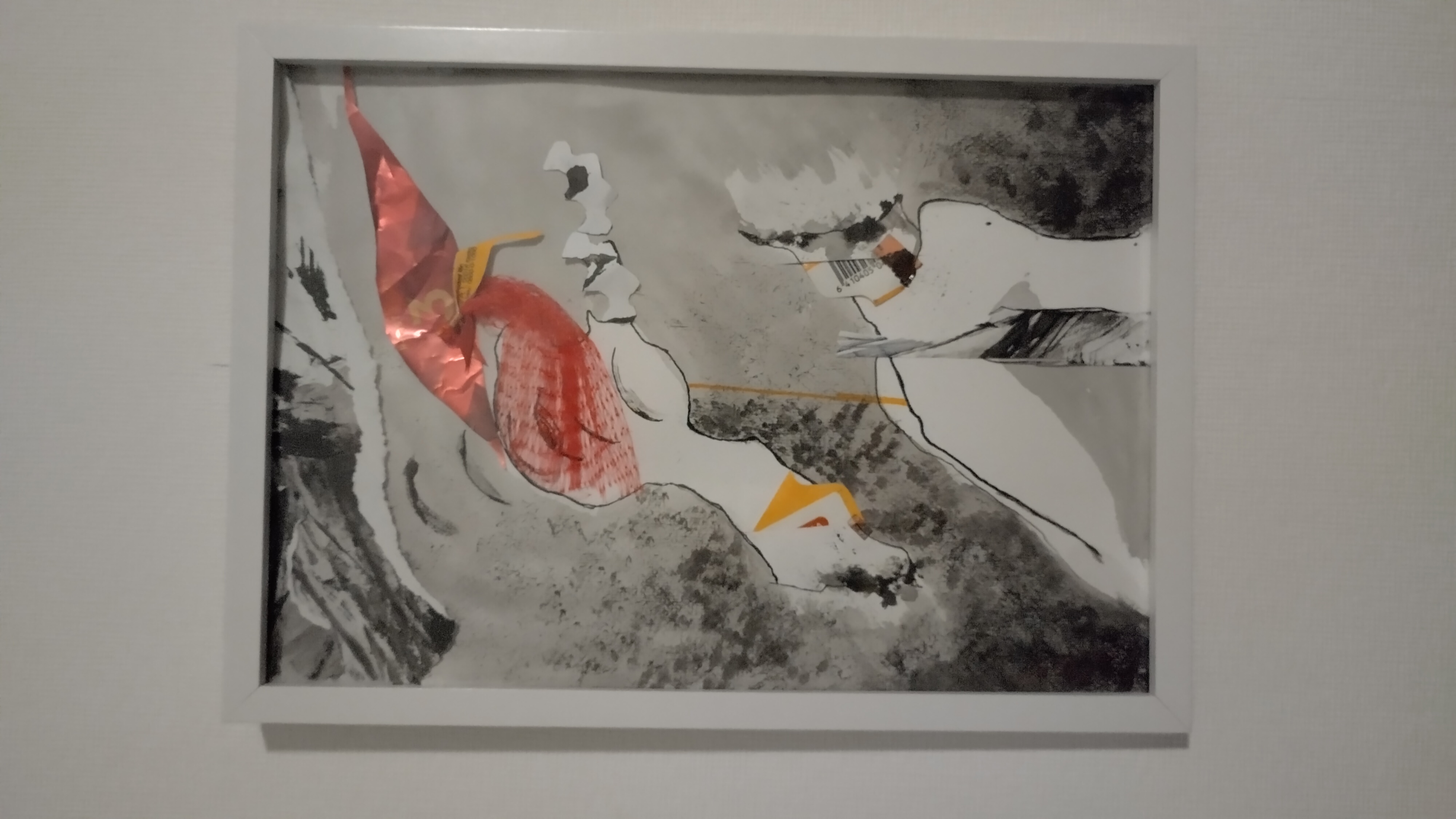 A collage triptych, A4 size, watercolor paper, ink, alcohol markers, paper cuts, pieces of presidentti ruby coffee package, assorted items and materials.