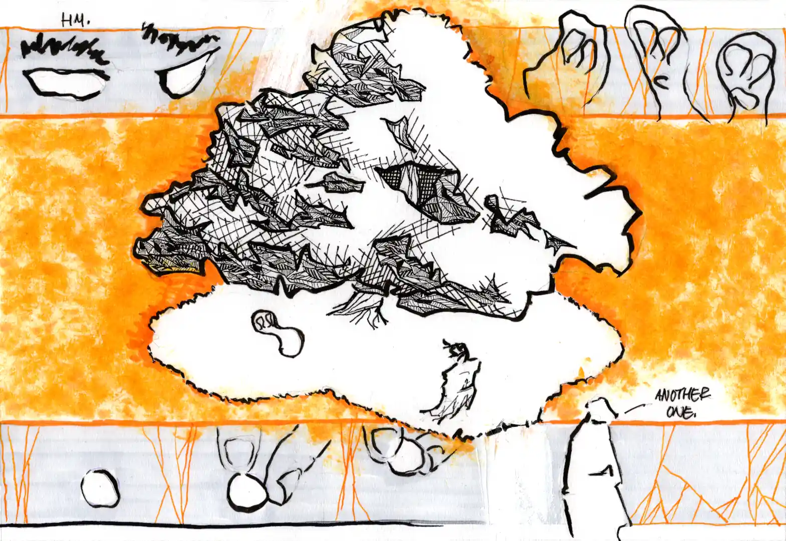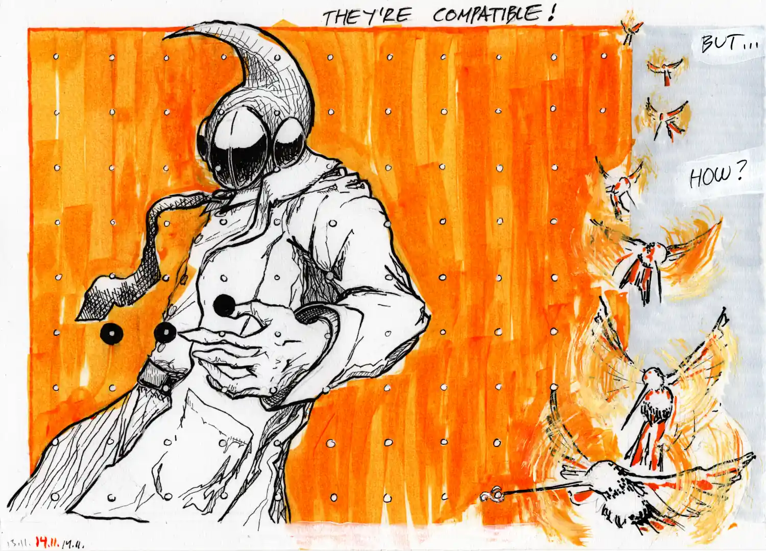 This is me drawing bigger pages (A4), a color and some new techniques. Exploring a set of certain things and ideas with a sort of doodling mentality. Presentation here is still WIP.