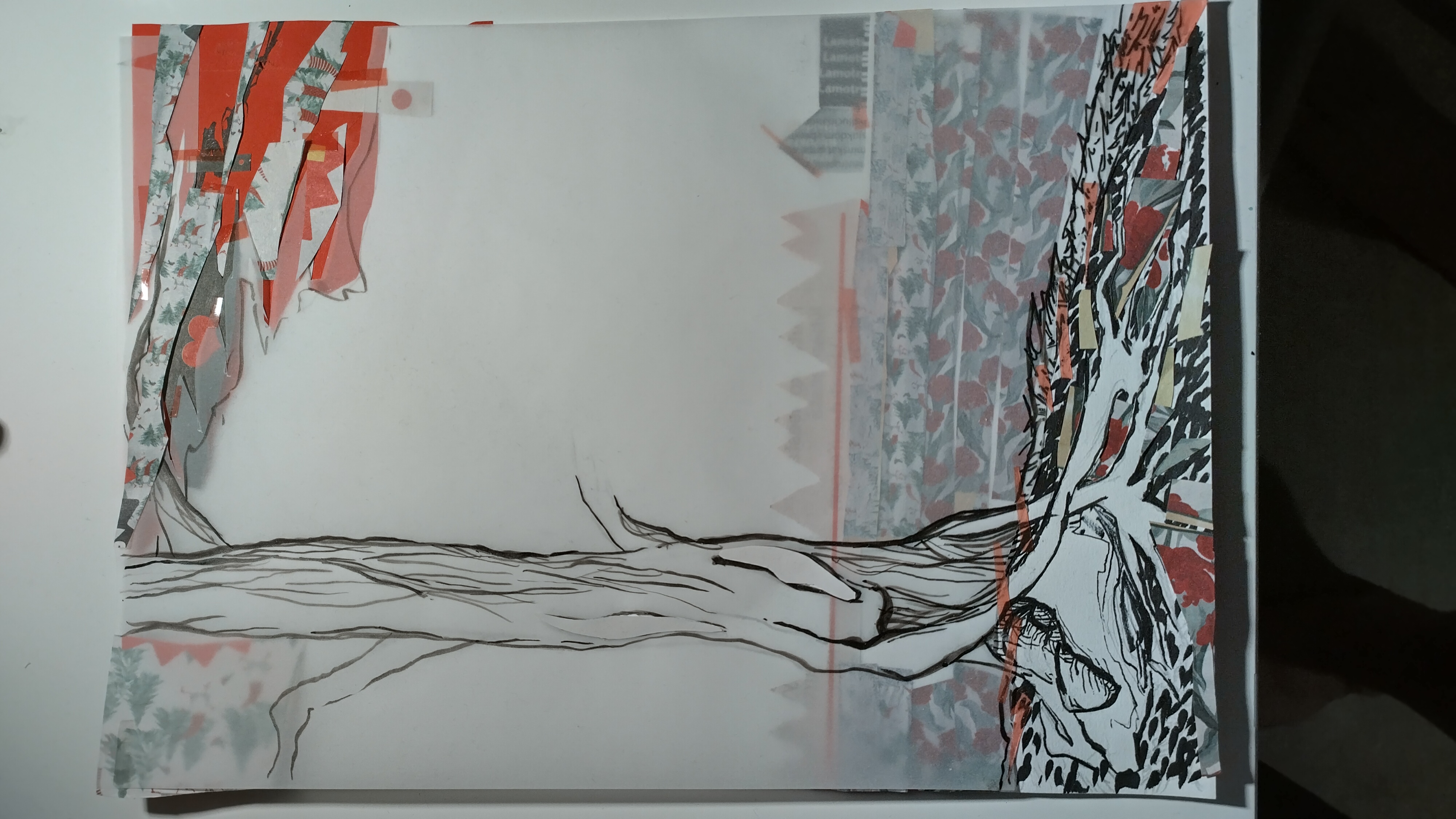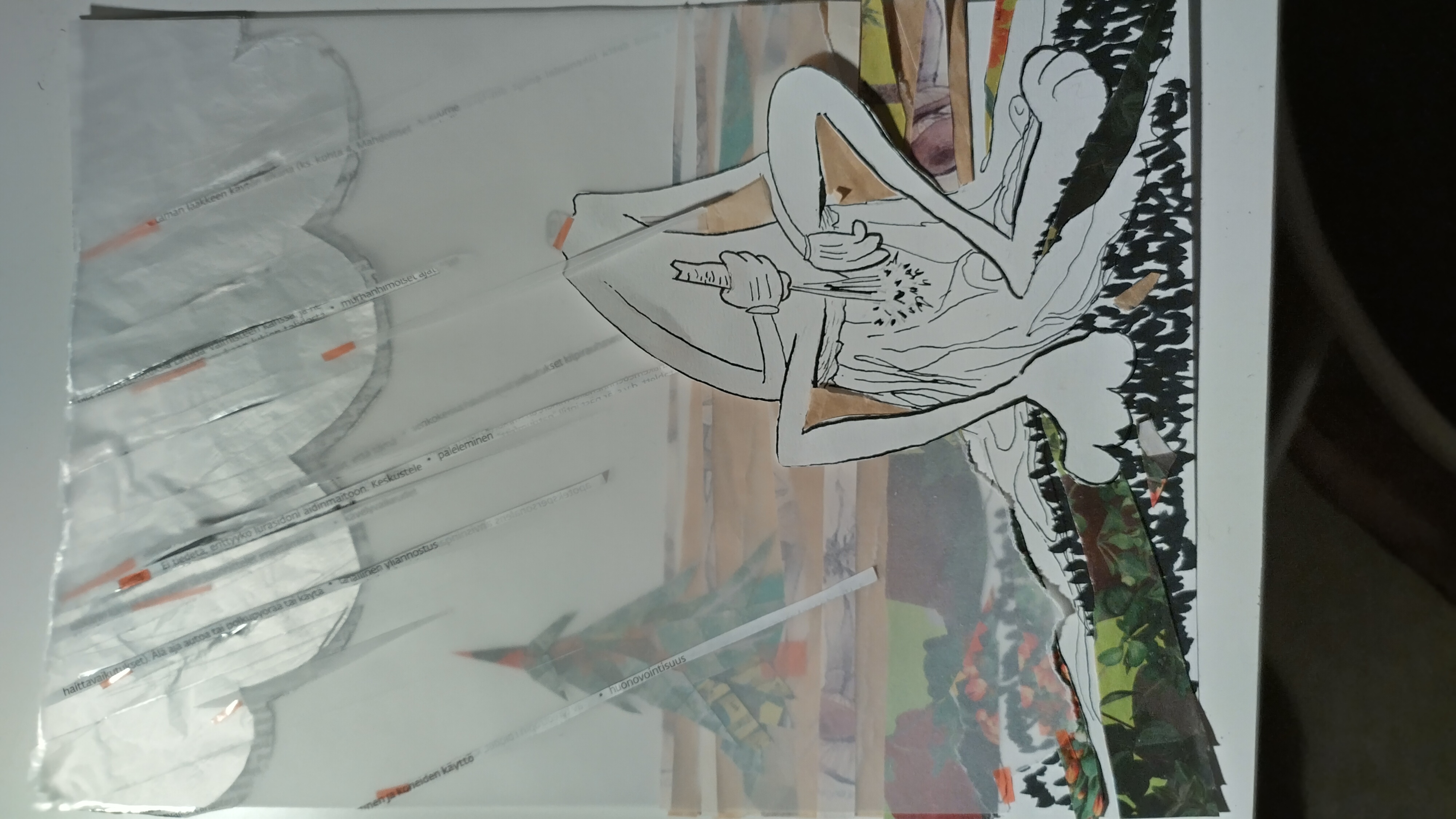 A collage diptych, A4 size, paper, ink, alcohol markers, transparent sheet, paper cuts, newspaper clippings, medicine package leaflets, foil, assorted materials.
